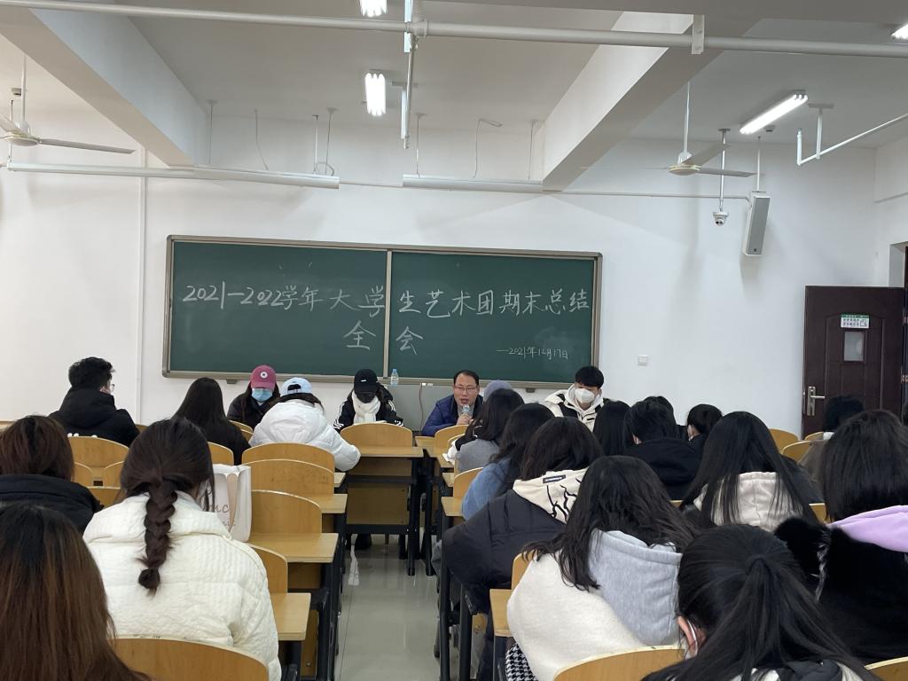 12月17日中午,大学生艺术团在综合楼501教室,召开2021—2022学年第一学期期末总结大会。校团委书记郑山峰出席会议。艺术团负责人詹研、刘子源、耿怡涵及全体成员参加了总结大会。刘子源主持了会议。