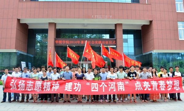 张莉作了重要讲话。她指出,开展大学生暑期社会实践活动,既是高校思想政治教育的生动课堂,又是青年成长的必由之路,是学生接触社会、了解社会、服务社会,培养创新精神和实践能力的重要途径。她对即将出征的同学们提出四点希望:一是希望同学们把社会当作学习的大课堂,脚踏实地,勤思多问,努力提高自己发现问题、分析问题、解决问题的能力;二是希望同学们敢于吃苦,不怕困难,积极投身“四个河南”建设,为实现中原崛起河南振兴富民强省奉献青春智慧和力量;三是希望同学们在实践活动中充分发挥自身的专业优势,积极传播科学技术和现代文明,把理论与实践紧密结合,以此提高自身实践应用能力,以实际行动推进学院转型发展,展现华锐师生积极进取、健康向上的精神风貌;四是希望志愿者们服从安排,统一行动,加强纪律,周密考虑,确保安全。