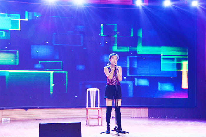 比赛现场,第四届校园歌手大赛优秀选手初梓琳演唱了激情四射的歌曲《冬天里的一把火》。