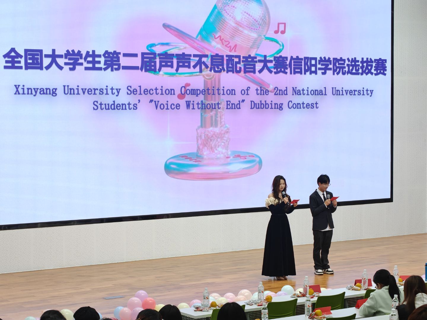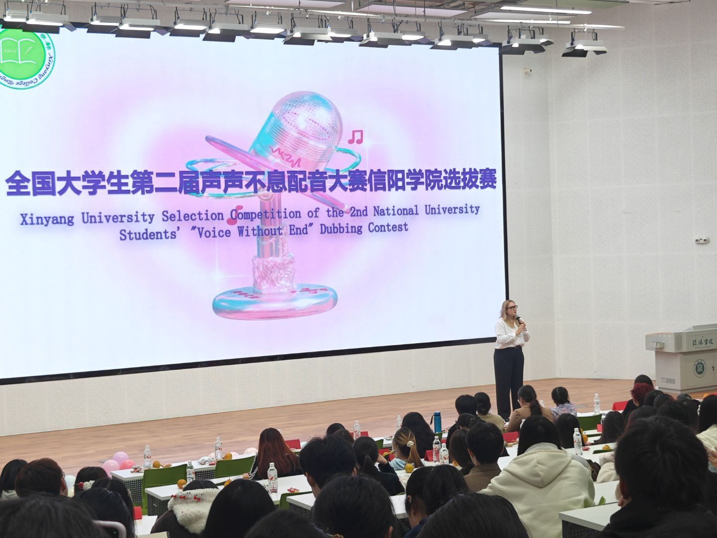 11月12日晚,第二届“声声不息”全国大学生配音大赛信阳学院选拔赛在教二楼117举行。本次活动由外国语学院主办、英语俱乐部承办,英语俱乐部指导教师陈俊明、外教Anna老师、外国语学院马娟、王斐、徐霞、乔锐和余凤等老师以及往届冠军代表担任了评委。外国语学院师生代表和学校其他社团代表也观看了本次配音大赛。活动由高浩苒、周子程同学主持。