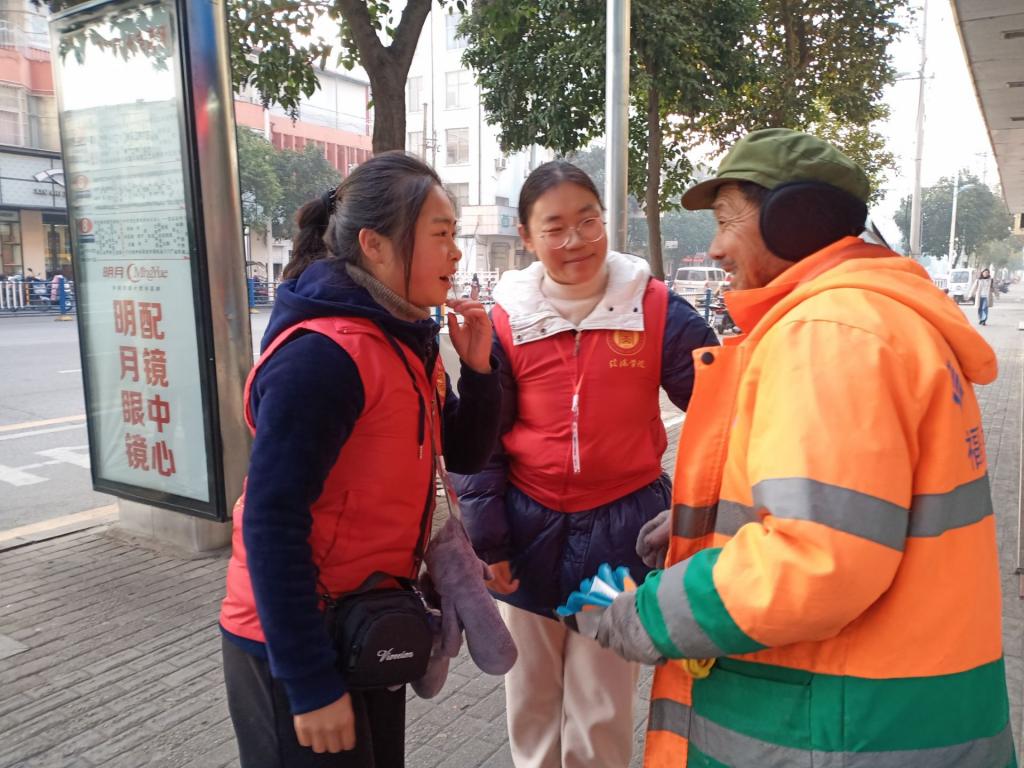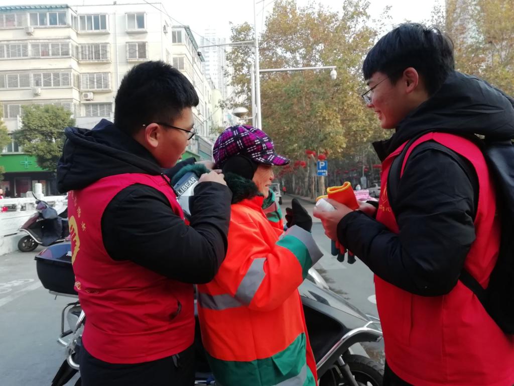 进入12月以来,志愿者服务中心在校园内开展了本次活动的前期募捐活动,我校师生纷纷捐款,奉献爱心。12月8日清晨,志愿者们带上手套、口罩、护手霜等物资,分为三组前往市区,为正在劳动的环卫工人送去温暖,并将学校师生的美好祝愿一同带给了他们。