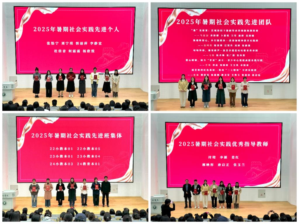 盘点成绩鼓干劲,表彰先进树榜样。大会在表彰环节中拉开序幕,对暑期社会实践中表现突出的先进集体、先进个人、优秀团队及指导教师予以集中表彰。荣获“先进班集体”称号的班级包括22小教本01、22小教本05、23小教本01、23小教本04、24小教本03和24教育本01,这些班级在团队组建数量、个人实践参与率、实践成果产出等方面表现优异,发挥了良好的示范引领作用。在个人与团队方面,7名在豫籍大学生“返家乡”、河南共青团“向基层报到”等活动中表现突出的学生荣获“先进个人”称号;5支“三下乡”实践团队凭借高质量的项目执行与成果被评为“先进团队”;6位全程参与指导、助力项目质量提升的教师获评“优秀指导教师”。