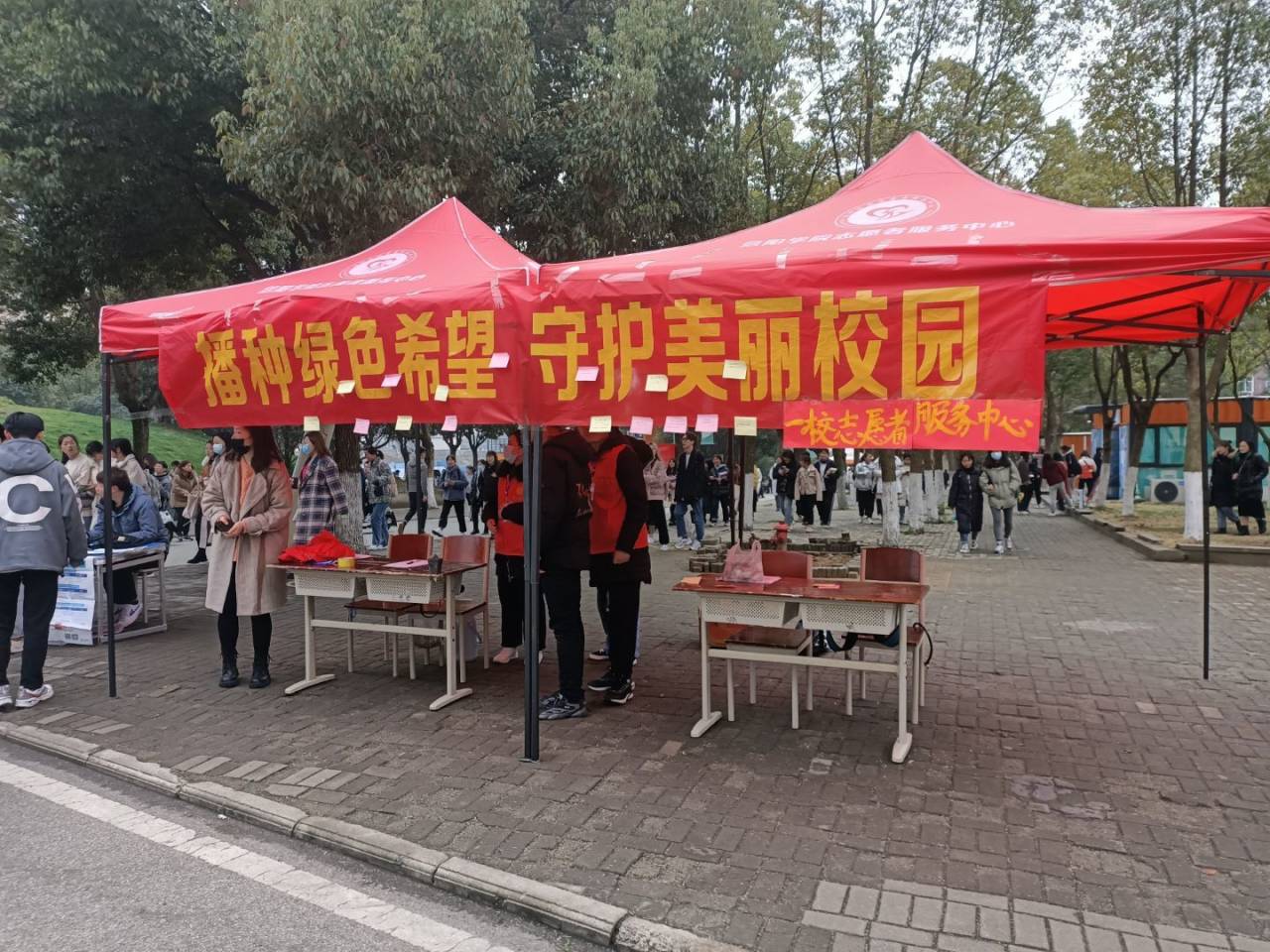 3月10日至12日我校志愿服务中心在学院餐厅旁活动广场和艺术楼对面场地开展了“播种绿色希望 守护美丽校园”植树节活动。