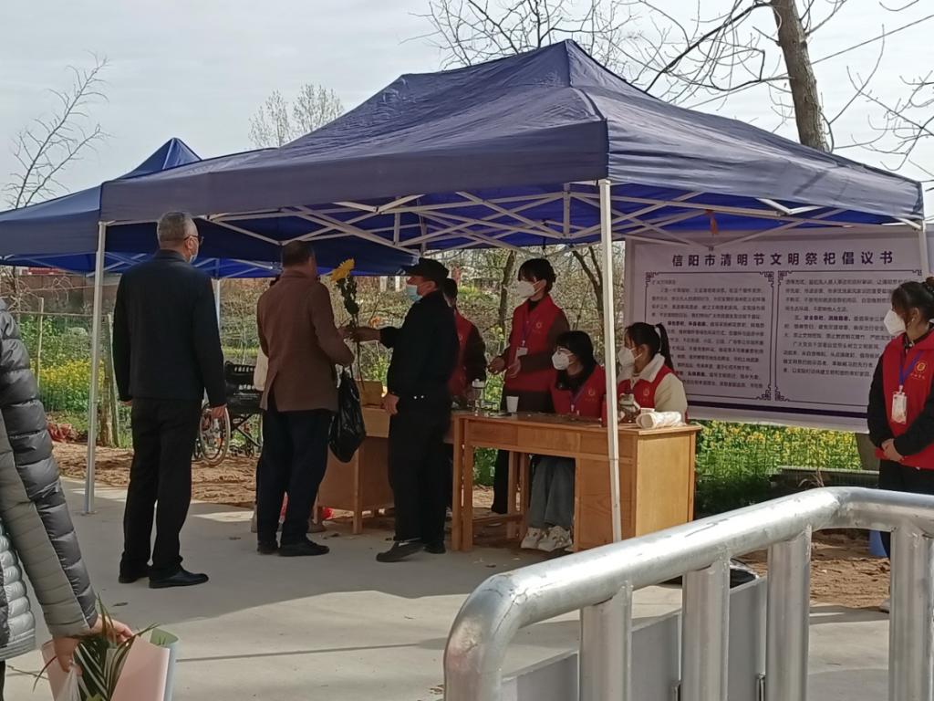 信阳贤山公墓有近1.5万座“仙逝”之墓。自2017年起至今,连续开展六年的“文明祭祀”宣传活动颇有成效,市民们将“烧纸”变成“鲜花”来寄托哀思。本次志愿活动在贤山公墓工作人员的指导下,倡导市民继续使用鲜花来追悼亲人,并采取用烧纸即可免费兑换鲜花的方式来鼓励市民文明祭祀。志愿者们耐心地为市民讲解如何换取鲜花,并且积极维持进出口的秩序,赢得了大家的一致肯定。信阳市贤山公墓的志愿服务工作人员也对志愿者表示感谢和赞许,并且期待与志愿者们的下一次合作,这是对信阳学院志愿者服务中心的充分肯定,同时也将激励志愿者们积极投身下一次志愿服务活动。