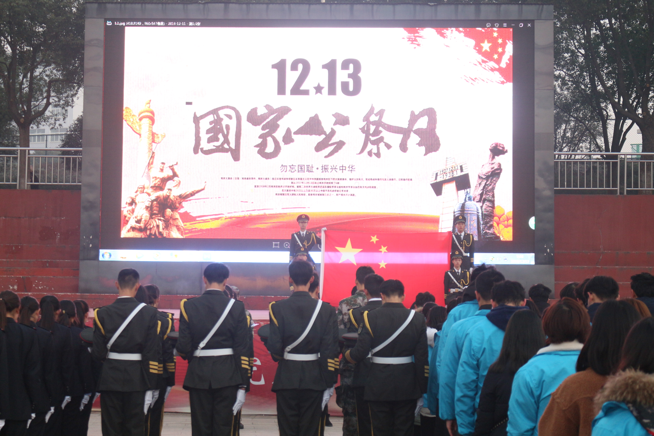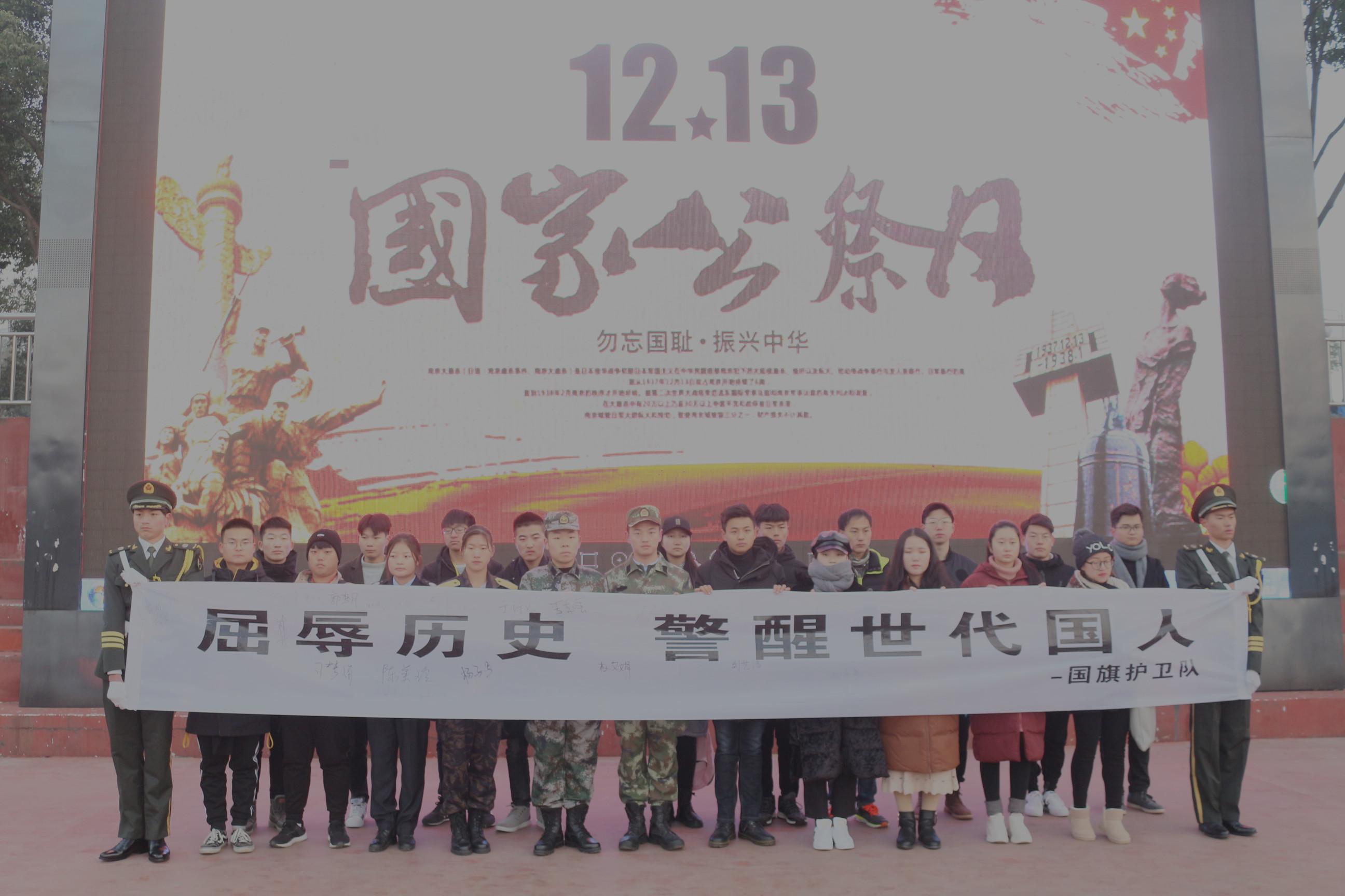12月13日清晨天微亮,学校田径场满地白霜,在寒风中,我校学生会、社团联合会、团委助理、飞鹰运动协会、军事爱好者协会等多个学生团体的同学们,参加了由我校国旗护卫队组织的主题为“勿忘国耻·振兴中华”国家公祭日仪式,向南京大屠杀遇难同胞寄哀思。