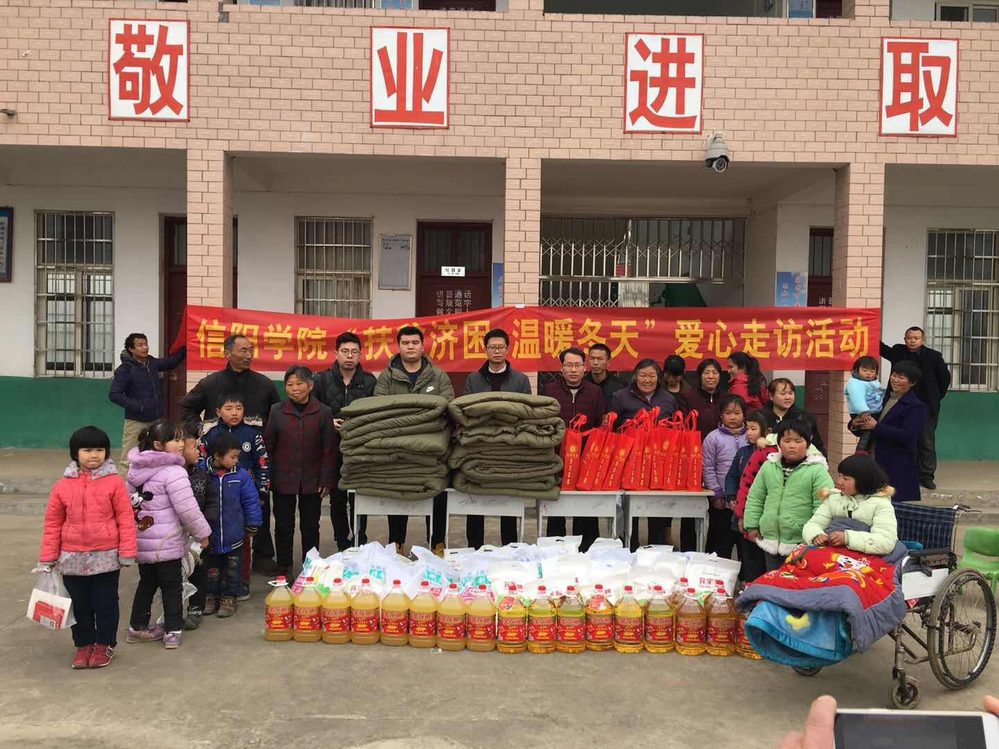 2月9日,带着学校师生对贫困山区群众的爱心,校团委副书记郑山峰与相关老师徐远东、周扬、胡世奇一道,前往新县吴陈河镇阳土墩村和八里畈镇南冲村开展“百团百队百号结百村”2017希望工程温暖冬天扶贫慰问活动。为两个乡镇的20户贫困家庭送上了米、面、油、棉被、春联等春节慰问品,以及我校订制的保温杯等爱心大礼包,受到当地干部及群众的热情欢迎。