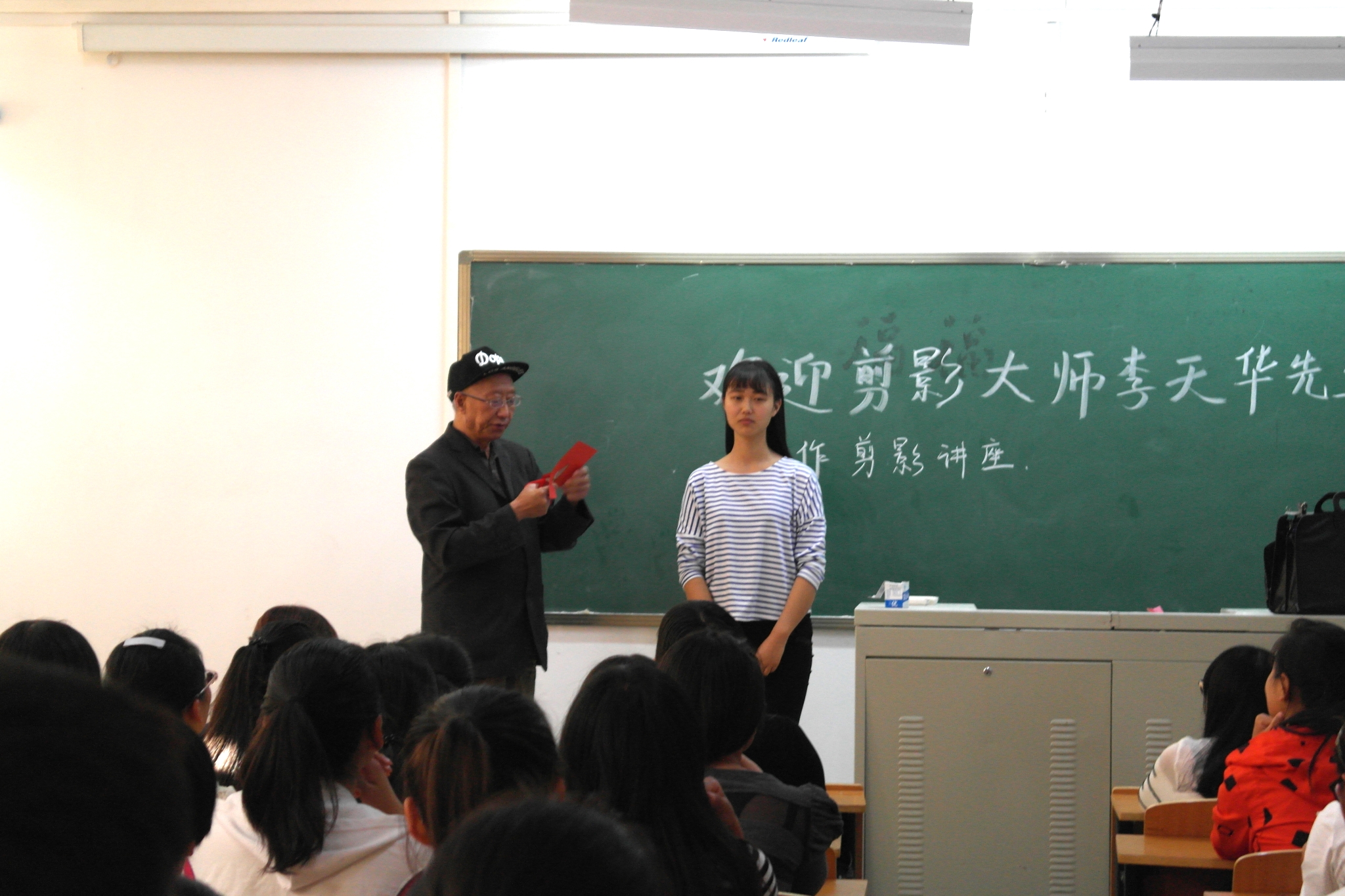 李天华先生讲到,剪人物侧影需要遵从1:3的原则,要持之以恒的学习与坚持,便可熟能生巧。他一边为大家讲解,一边师范,剪出的影像惟妙惟肖,深受广大同学的喜爱。针对当前剪影手艺面临失传的困境,他呼吁我院的广大剪影爱好者能够喜欢这门艺术,认真学习,不断进步,做剪影艺术的传播者。
