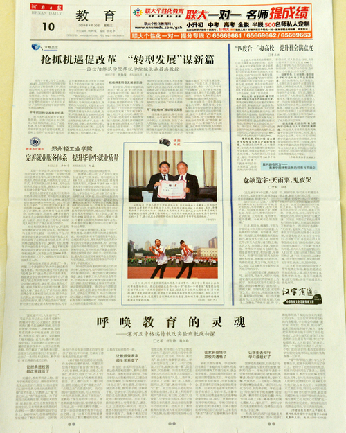 2014年4月30日出版的《河南日报》,在第10版(教育专版),头条刊发题为《抢抓机遇促改革“转型发展”谋新篇 ——访信阳师范学院华锐学院院长施昌海教授》的长篇报道文章,介绍我院在转型发展改革过程中的初步思考和探索。