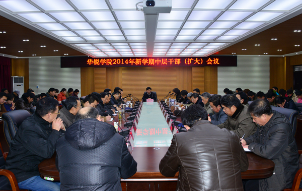 2月16日上午,我院2014年新学期中层干部(扩大)会议在行政楼208会议室召开,学习贯彻上级会议精神,部署2014年工作。院长施昌海,院党委书记张莉,常务副院长高云,副院长王志华、毛海涛,院长助理杨高伟出席会议,各系各部门负责人和全院中层干部及有关特聘教授参加了大会。会议由张莉主持。