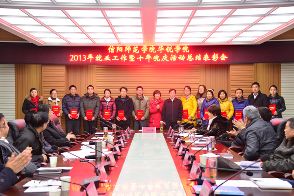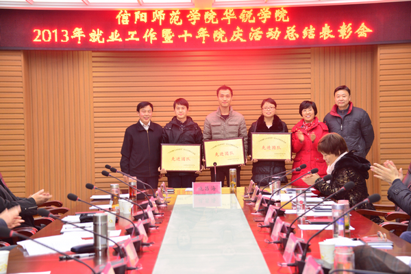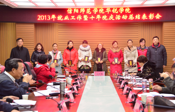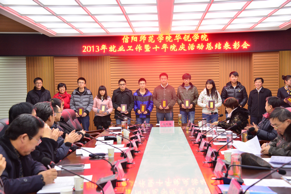 会上,常务副院长高云宣读了《关于表彰“十年回眸与未来展望”研讨会及院庆活动先进团队和先进个人的决定》、《关于表彰2013年度就业工作先进个人的决定》和《关于调整信阳师范学院华锐学院毕业生就业工作领导小组的通知》等文件。院长助理杨高伟传达了河南省2014年大中专毕业生就业工作及就业创业服务进校园活动启动仪式和2014年全国普通高等学校毕业生就业工作网络视频会议精神。招生就业部负责人郭二军总结了2013年度毕业生就业工作,安排部署了2014年就业工作。社会科学系主任陈录生、数学与计算机科学系主任郝涌和外语系主任罗德喜分别在会上交流了毕业生就业工作经验。先进集体和先进个人代表李沛老师、李平老师和王胜楠同学分别作了发言,满腔热情地回顾了院庆期间师生热爱学院、团结奋进、追求卓越的感人事迹,表达了继续发扬院庆精神,进一步完成各项工作和学习任务,促进学院更好更快发展的信心和决心。(宣传部供稿)
