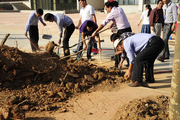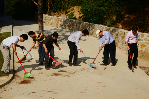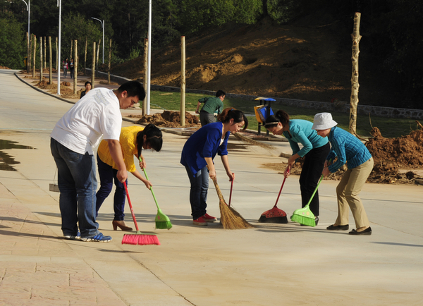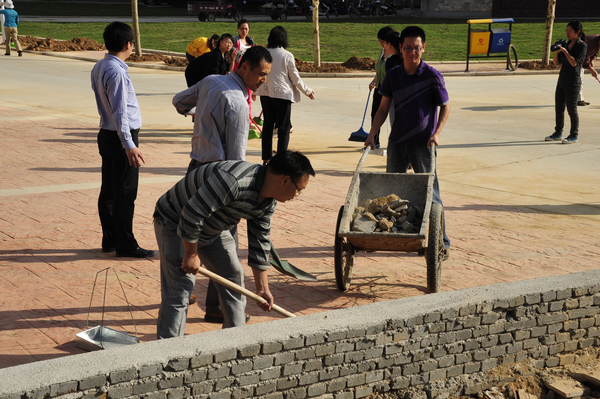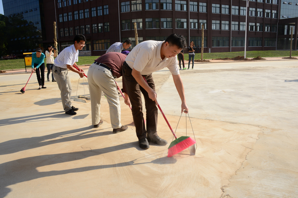 做清洁环境的先行者,做文明校园建设的带头者。下午三时,院领导们就已经到达了责任区,挥起铁锹、扫帚就热火朝天地投入到清理垃圾、灰尘的劳动中,亲力亲为,以身示范。各单位负责人和工作人员也出力流汗,干劲十足。你铲土清淤,他搬石推车,不顾尘土脏污,不顾炎炎日晒,大家携手并肩,合力清理。在一个多小时的辛苦和忙碌后,行政楼周边区域已变得整洁卫生。