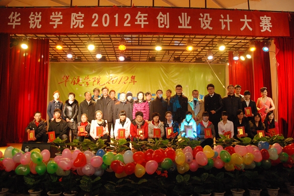 12月21日,由招生就业部和团委联合举办的华锐学院2012年创业设计大赛在大学生活动中心举行。院长郑定豪、党委书记祝军、常务副院长高云、副院长王志华出席会议并为获奖团队颁奖,各相关单位负责同志、指导老师及800余名学生代表观摩了比赛。