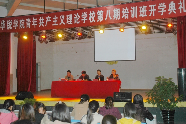 为迎接党的十八大胜利召开,引导广大青年学生用中国特色社会主义理论体系武装头脑,坚定走中国特色社会主义道路的理想信念,11月1日晚,我院青年共产主义理论学校第八期培训班开学典礼在大学生活动中心隆重举行。我院办公室副主任、教工一总支副书记张俊忠,团委副书记张富庄,党委秘书万建章,团委干事韩春子和750余名青校学员一起参加了开学典礼。开学典礼由韩春子主持。