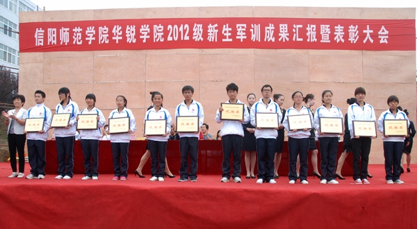 会上,分别进行了分列式和军体拳项目的汇报表演。各军训班级士气高昂,口号响亮,动作整齐划一,精彩的表演赢得在场观众的阵阵掌声。院办公室主任张柏平宣读了表彰《关于表彰2012级新生军训先进集体和优秀教官的决定》。与会领导为获得先进班集体的10个军训班级,获得内务整理优胜奖的12个军训班级,获得军体拳优胜奖的12个军训班级,获得分列式优胜奖的12个军训班级和获得优秀教官的20位教官颁奖并合影留念。