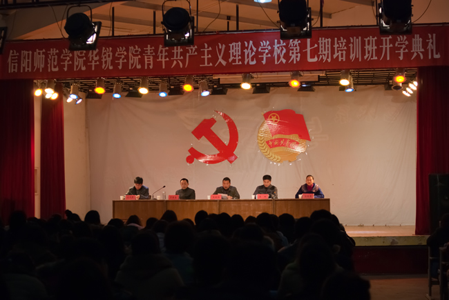 3月20日晚,我院青年共产主义理论学校第七期培训班开学典礼在大学生活动中心隆重举行。信阳师范学院党委组织部副处级组织员王建旭,我院外语系主任罗德喜,党委委员、团委书记李明,党委秘书万建章,团委秘书高昌慧和700余名青校学员一起参加了开学典礼。开学典礼由李明主持。