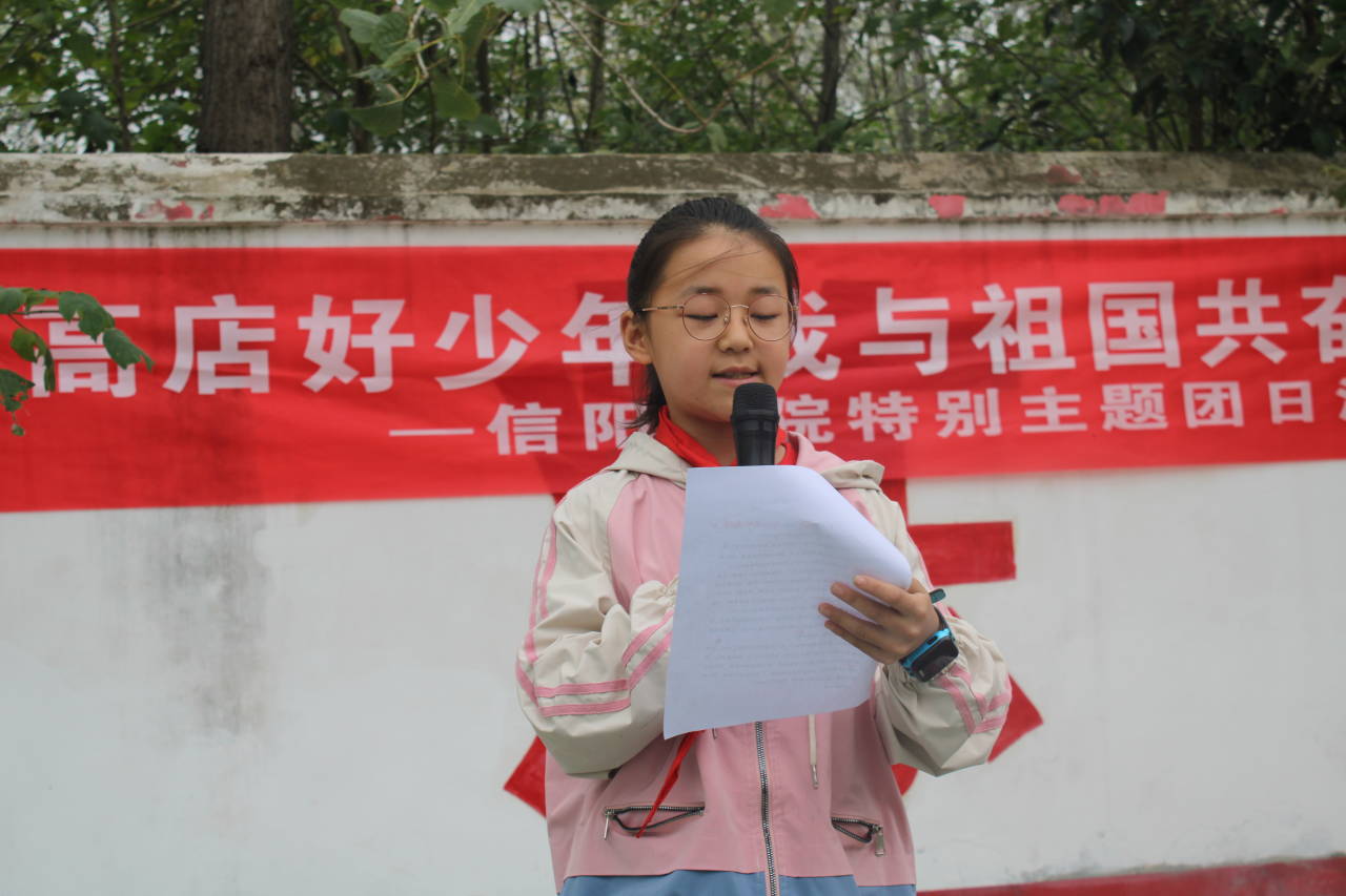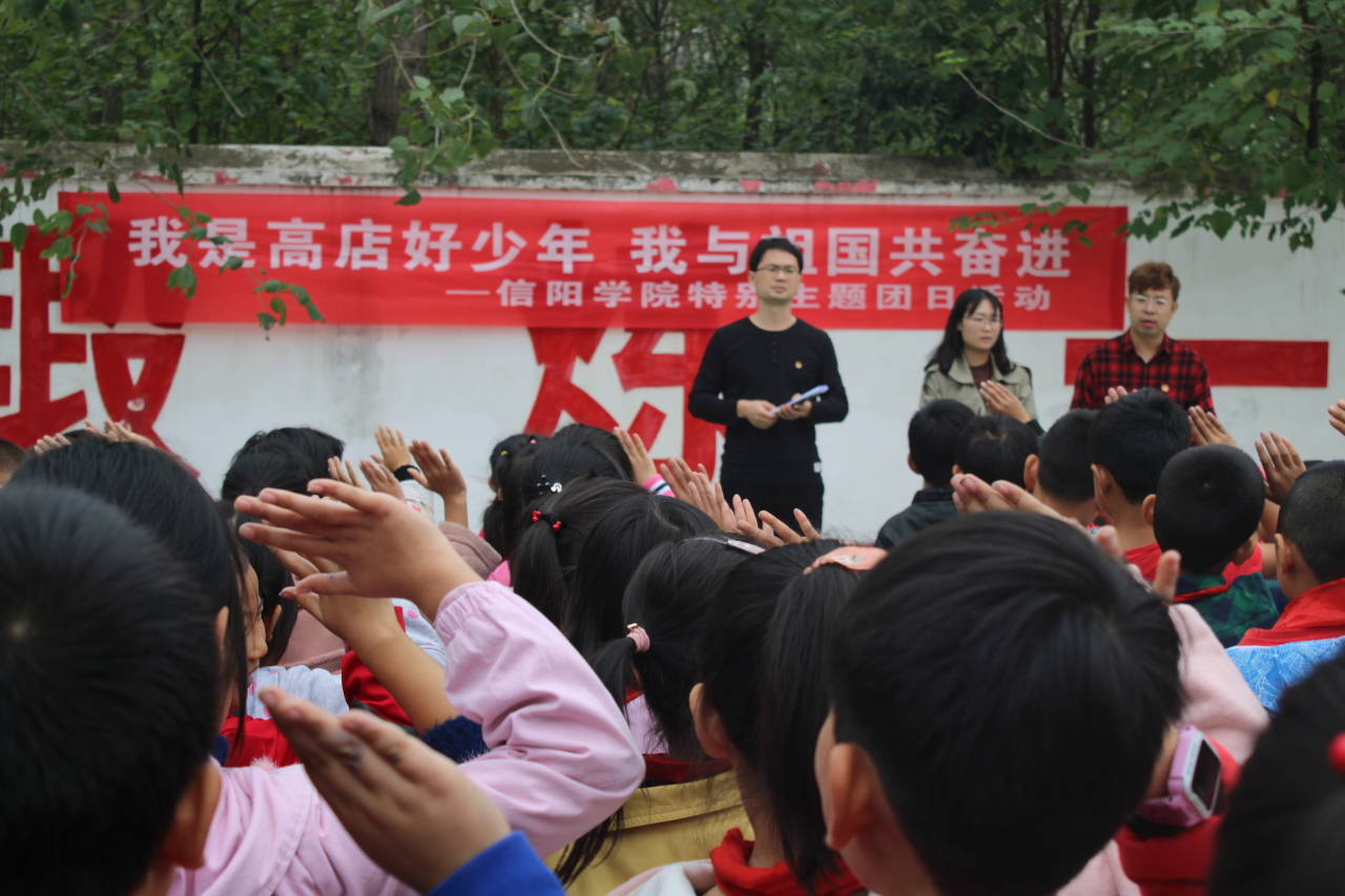 在第6个国家扶贫日之际,10月22日上午,主题为“我是高店好少年·我与祖国共奋进”信阳学院特别主题团日活动在高店中心学校举办。高店中心学校副校长田春海,省派驻村“第一团支书”、校团委周扬、社会科学学院相关教师余洁,我校学生干部思想政治理论宣讲实践团成员,以及高店中心校100余名师生代表共同参加了本次活动.本次活动分别开展了“国旗下的演讲”、未成年“四防”教育课活动,并给学校的孩子们送来了关怀和温暖。