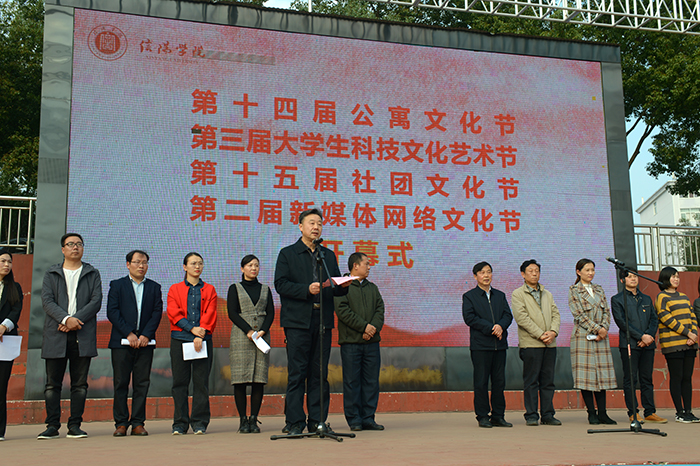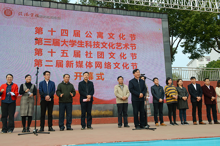 11月5日下午,我校第三届大学生科技文化艺术节、第十四届公寓文化节、第二届新媒体网络文化节、第十五届社团文化节在田径场开幕。专职副书记施昌海、副校长王志华出席开幕式。党办、宣传部、教务处、学工部、团委、后勤处等有关部门负责人,各学院党总支书记、团总支书记、辅导员、社团指导教师代表、社团联合会成员代表、各学院学生代表等参加了开幕式。党委办公室主任娄琪主持了开幕式。