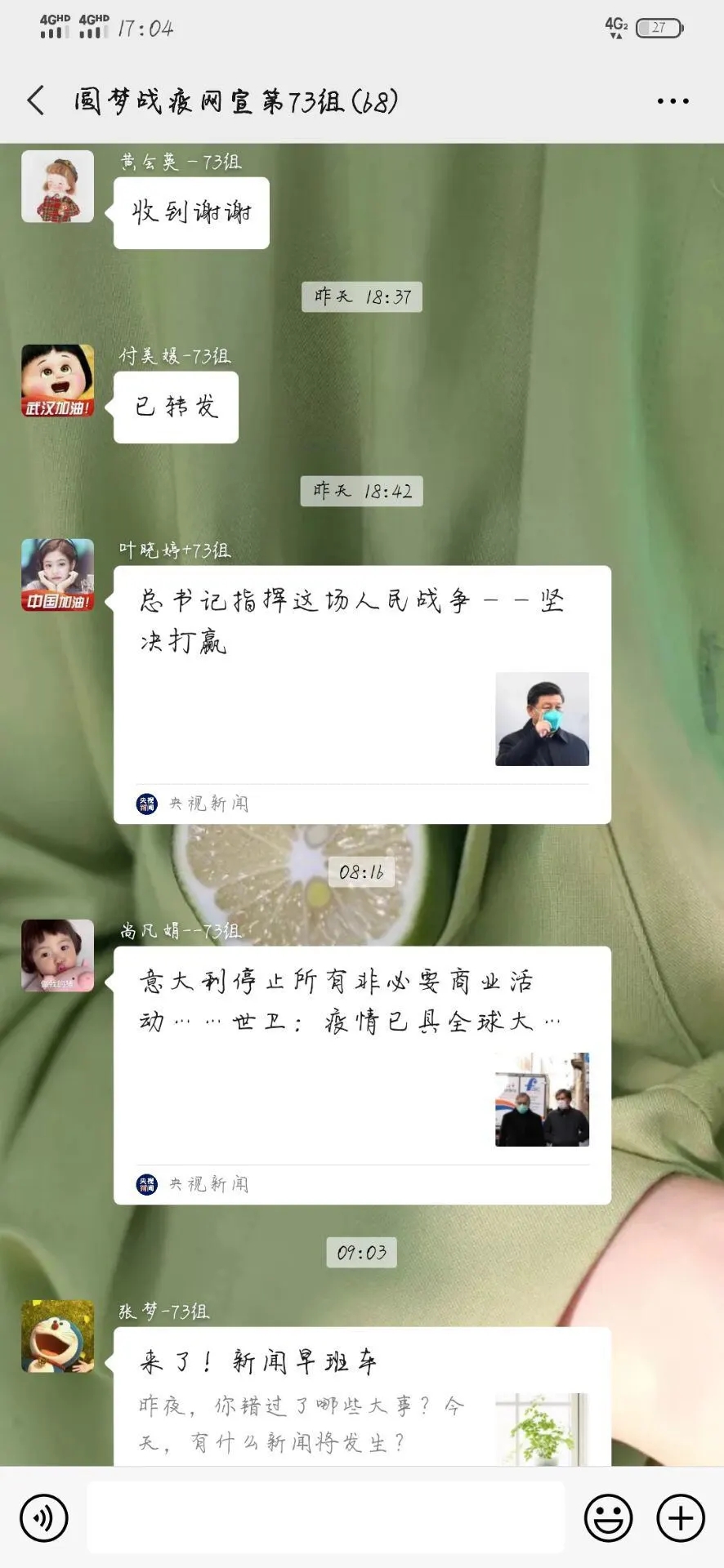 一个偶然的机会,2019级教育学院本科7班的刘亚玟同学得知了一个叫圆梦公益·圆梦战役的线上活动,这个活动让很多大学生可以在线上做志愿者,她便很快加入了。活动中,她通过文字、声音、图片和视频传达疫情和相关信息,也号召让越来越多的爱心人士加入进来,她和志愿者们每天做一些公益型的宣传广告,最后把广告费捐助给疫情严重的地方。磨砺中能成长,也能收获友谊。通过这次志愿服务活动,她也结识到了很多来自祖国各地的志同道合的志愿者们,最近,她这样对结识的志愿者说:“春风一悦,便可渡生机,不久我们还要相约于来年,吃武汉热干面,欣赏武大的樱花。”