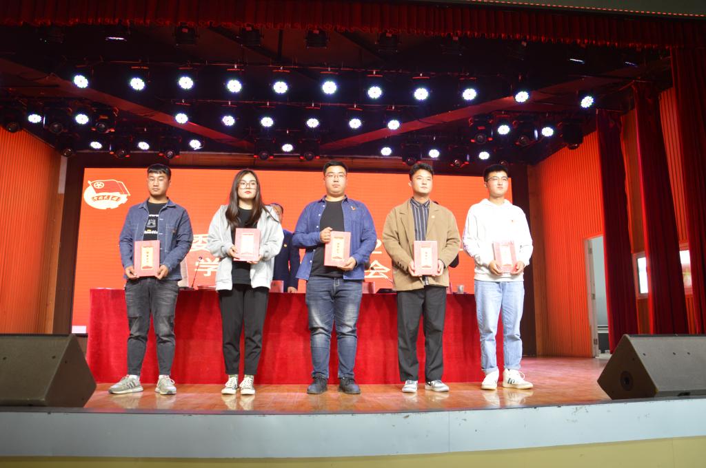 大会在激昂的国歌声中拉开帷幕。会议分为三个阶段进行。第一阶段,徐媛老师宣读了《关于表彰2019—2020学年优秀学生干部、团学工作先进个人的决定》,校团委老师共同为获奖代表颁奖。
