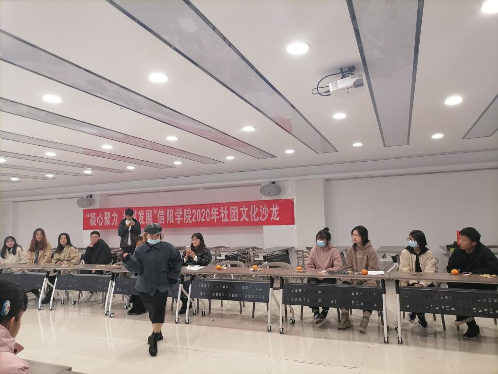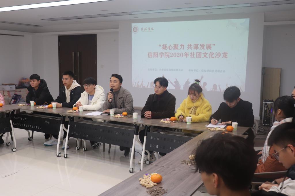 11月26日至12月3日,由校团委主办,社团联合会承办的信阳学院2020年社团文化沙龙在实训中心201多功能会议室举行。本次社团文化沙龙按照文化艺术、体育竞技、科技实践等大类分为三场开展,校团委张翰文老师、66个社团负责人、社团联合会主席团及成员代表共同参加了沙龙活动。张翰文老师主持了三场沙龙活动。
