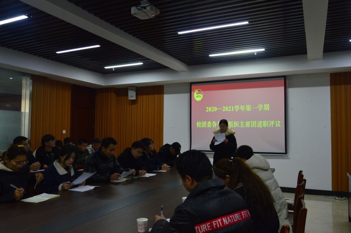 12月31日中午,校团委在综合楼715会议室召开2020—2021学年第一学期校级学生组织主席团成员述职评议会议。校团委全体老师出席会议。校学生会、社团联合会、志愿者服务中心、大学生艺术团、礼仪队、团委助理、大学生演艺管理中心和青年媒体中心等8个学生组织主席团成员参加了会议。