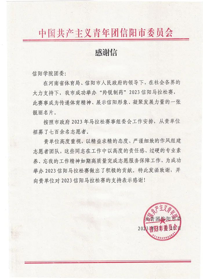 11月19日,由河南省体育局、信阳市人民政府主办的“羚锐制药”2023信阳马拉松鸣枪开赛,10000余名选手参赛。按照市政府2023年马拉松赛事组委会工作安排,我校积极响应支持,学校团委招募了721名学生志愿者参加了本次志愿服务工作。相应的组织工作和同学们的出色表现受到了团市委和社会各界的热情肯定和高度赞扬。为此,团市委专门发来信函给予积极评价,表示衷心感谢。