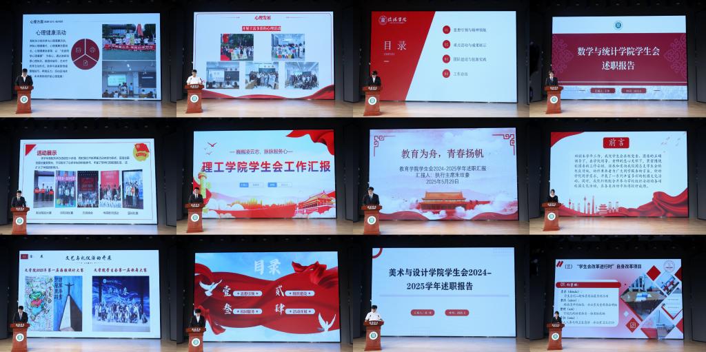 会上,各学生会执行主席依次登台进行学年述职汇报。他们全面梳理了过去一学年学生会开展的各项工作与活动,从文化建设、学业促进、权益维护等多个工作维度,深入剖析过往工作的亮点与不足,精心规划未来工作蓝图,并分享了一系列创新举措与实践成果,充分彰显了学生会在丰富校园生活、助力学生成长成才等方面发挥的积极作用。