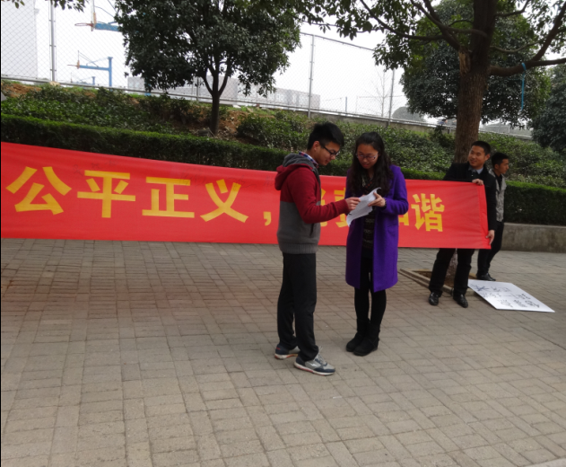 本次活动依据刚刚召开完毕的全国“两会”相关精神,通过在学院新餐厅门前和华锐主干道进行法律小知识大比拼、“公平正义、消费和谐”条幅签名、发放消费者权益保护宣传单等形式进行开展。