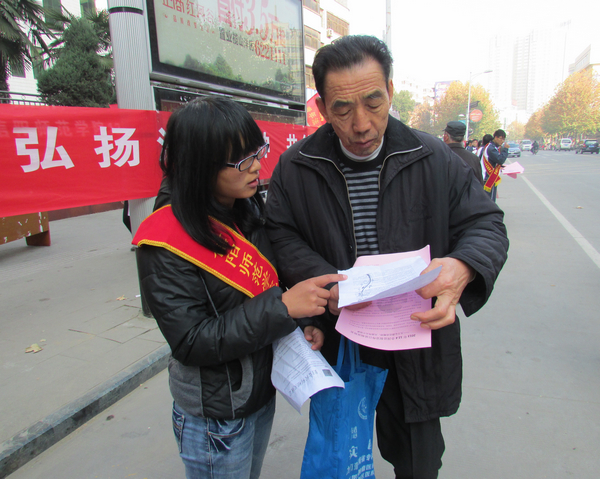 在该系法学专业王章力老师带领下,志愿者一组前往市公安局附近进行普法宣传,另一组到火车站共和里社区,参加了由信阳市团委、浉河区团委、共和里社区党支部与我院社会科学系法律爱好者协会联合主办的“大学生法制志愿服务进万家”活动。活动中,志愿者们走进社区,向居民普及法律知识,为他们解答相关法律问题,得到了当地群众的一致赞扬。信阳晚报对此次法制宣传活动进行了全程跟踪报道,并对法律爱好者协会成员柳飞耀进行了采访。