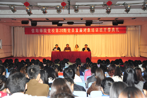 为了深入学习贯彻党的十八大精神,进一步提高学生党员发展对象的综合素质,10月28日晚,信阳师范学院党校第20期党员发展对象培训班开学典礼在信阳师范学院理科楼报告厅举行,信阳师范学院党校副校长、组织部副部长唐景旺,我院党委书记张莉,信阳师范学院组织部正处级组织员曾伏虎等和全体学员参加了开学典礼。开学典礼上,唐景旺为全体学员作了题为《进一步端正入党动机,争取早日成为合格共产党员》的首场辅导报告。