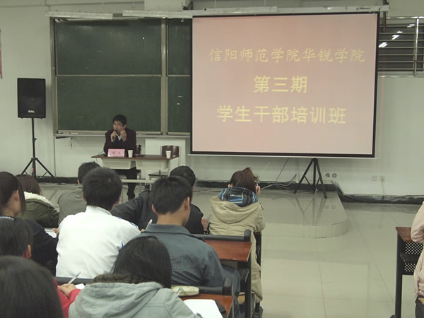 11月23日晚,信阳师范学院党委组织部胡波为学生干部培训班授课。