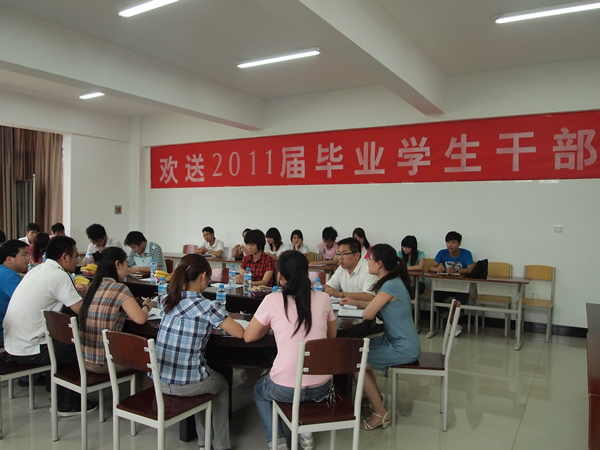 会上,祁艳华老师代表院团委向参加本次座谈会的2011届毕业学生干部送上了衷心的祝福,祝愿他们在今后的人生道路上一帆风顺、事业有成。随后,2011届优秀学生干部代表就个人工作经验、今后人生道路的选择分别做了发言。原社团联合会主席陈重阳和大家分享了自己做学生干部的几点经验,即,把握好自己、老老实实做人、踏踏实实做事;原中文系主席王越强调要“立足现实、放眼未来”,并提醒有志考公务员的同学,做到“厚积薄发、脚踏实地”;原理工系学生干部、以优异成绩被北京理工大学录取的任俊,告诉大家,在选择人生道路时要有一个明确的目标,任何时候都不要盲目跟风。最后,同学们就考研、就业、工作等问题展开了热烈的讨论。