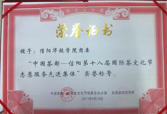 在中国茶都——信阳第十八届茶文化节期间,我院积极响应共青团信阳市委的号召,组织96名青年志愿者积极参与茶文化节志愿服务活动,用实际行动弘扬了志愿服务精神,展示了我院青年学子的青春风采。我院团委被信阳茶文化节组委会和共青团信阳市委授予“信阳市第十八届国际茶文化节志愿者服务先进集体”荣誉称号,我院侯晨露等15名同学被授予“优秀青年志愿者”荣誉称号。