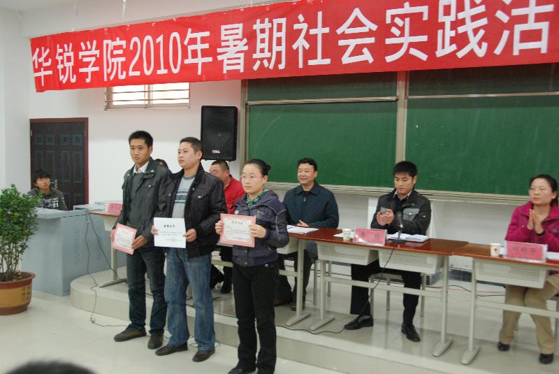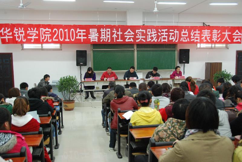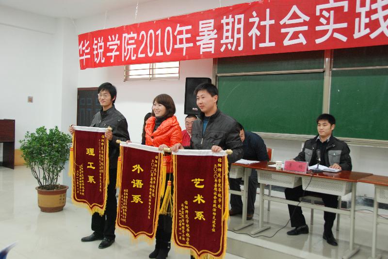 会上,郑东来老师对信阳师范学院华锐学院2010年大学生志愿者暑期“三下乡”社会实践活动进行了总结。祁艳华老师宣读了《关于表彰2010年暑期大学生社会实践活动先进集体和个人的决定》。