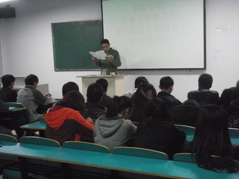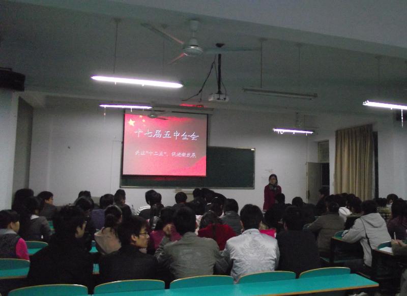 本次学习讨论活动由各系分组进行,各系高度重视,组织得当,学员准备充分,会场讨论热烈,大家围绕十七届五中全会精神和《中共中央关于制定国民经济和社会发展第十二个五年规划的建议》各抒己见,热烈讨论。理工系行政秘书、党总支副书记胡秀云老师首先向大家介绍了“十二五”的重要性,并强调了学习十七届五中全会精神的长期性,团总支书记杨晓杰老师联系十七届五中全会对国家中长期教育改革与发展纲要的相关问题结合工作实际进行了解读。外语系在团总支书记李肖利老师带领大家对十七届五中全会精神进行了学习,同学们通过观看幻灯片对十七届五中全会精神进一步了解。艺术系行政秘书陈金强老师和大家围绕民生与发展的问题进行了讨论。中文系、土木工程系,数学与计算机科学系、社会科学系也通过解读十七届五中全会、播放幻灯片、分组讨论等形式认真深入地学习了十七届五中全会精神。