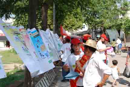 改革开放成就宣讲服务团队员们充分利用标语、宣传图片、现场咨询、分发“中国改革开放记忆中的三十件大事”的宣传材料1000多份等形式,热情主动地向过往群众宣讲改革开放成就,以及党中央提出的科学发展观、构建和谐社会、建设社会主义新农村、现代农村新文明行为规范、实现我省“两大跨越、两大建设”的任务、信阳市六城联创等方面的方针、政策。在咨询台前,同学们不畏酷暑、不辞辛苦,一遍遍地向村民们讲解党和国家新近出台的农村政策、法律法规。为了便于村民们清晰快捷地了解有关政策信息,队员们在挂出50余幅图片资料前,逐一向村民们进行讲解,吸引了不少村民围观,让乡亲们在轻松愉快地氛围中学到了知识,开阔了眼界。拉近了村民们和同学们的距离,同学们的良好表现得到了当地百姓的称赞。