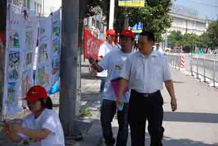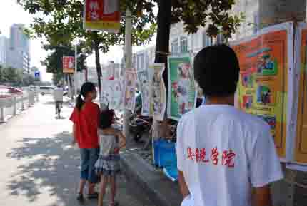 在信阳市和美广场,队员们一到地点就立即悬挂好有关宣传图片,顾不上休息,便向过往的群众发放宣传材料。这期间,有不少的群众驻足观看宣传图片,并就宣传材料中的有关内容进行咨询,同学们积极主动地与各位行人进行交流,并向各位行人耐心细致地讲解有关知识。