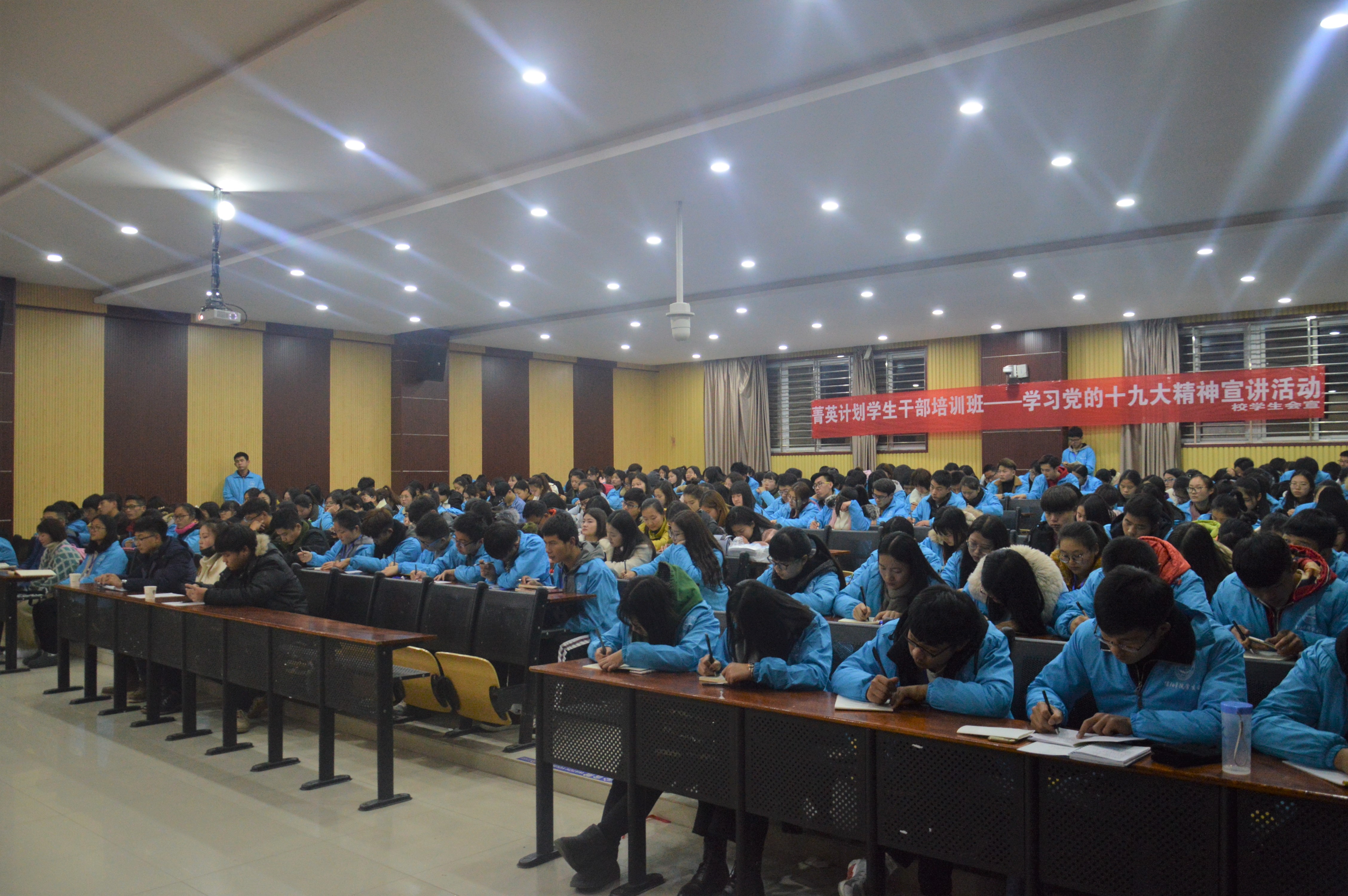 12月22日晚,校学生会在图书馆102室举办了“菁英计划”培训班——深入学习党的十九大精神宣讲活动。前校学生会副主席蔡天一,第十四届校学生会主席冯岩,副主席赵陶陶、樊泽洋、王朝晖,以及校学生会全体成员参加了本次培训班活动。