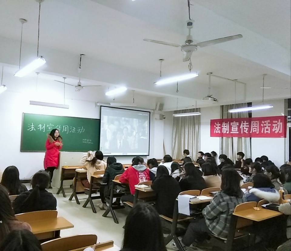 活动中,胡晶老师做了发言,她说,作为当代大学生,应普及法律知识,培养法制观念,弘扬法制精神,善于用法律维护自身合法权益。