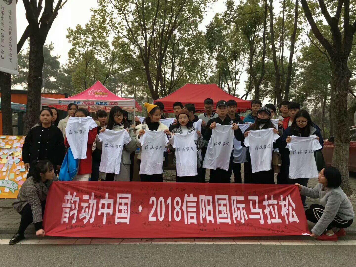 为推广马拉松运动,让我校更多的师生积极参与到2018年信阳国际马拉松赛中,11月23日至25日,阳光跑步协会在校园内设置宣传点对马拉松比赛进行宣传推广,同时为我校参赛的运动员们提供暖心的服务。