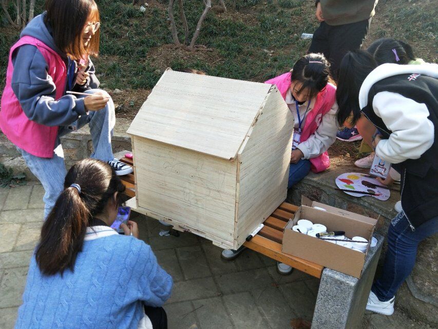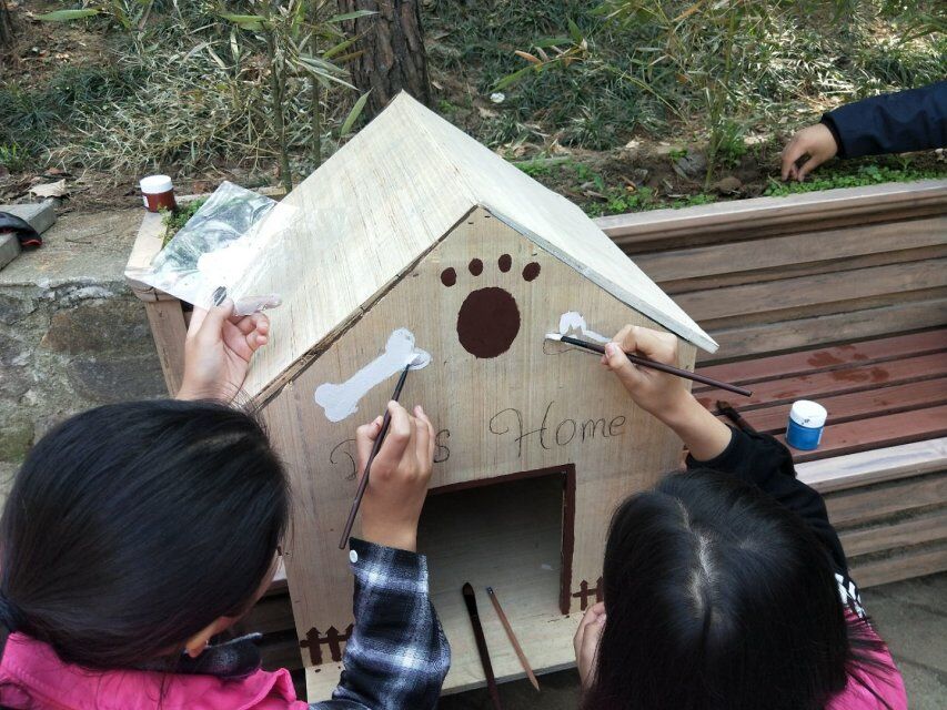 在协会负责人的带领下,成员们开始一起动手搭建简易狗窝。成员们分为三组,一边搭建一边对木质狗窝进行涂绘装扮。制作完成后,成员们将爱心狗窝放置在了校园里最合适的地方。