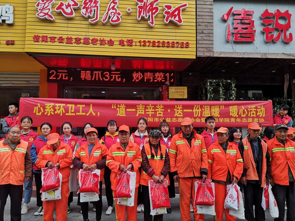 11月16日,青年志愿者协会联合信阳市公益志愿者协会爱心粥屋志愿服务站开展“致敬城市环卫工”活动。