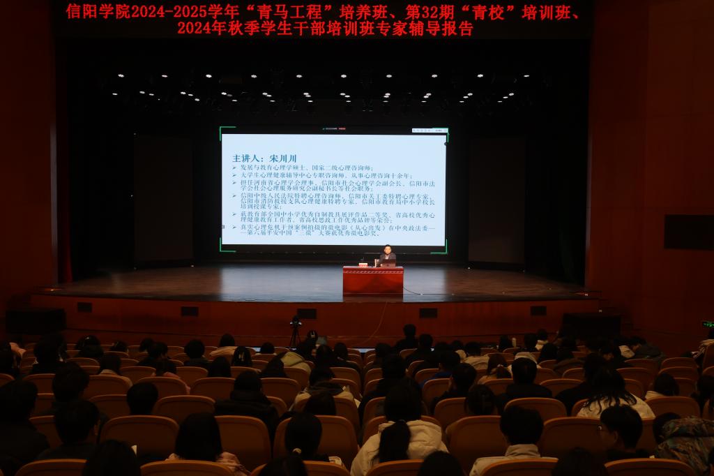 为深入学习贯彻习近平新时代中国特色社会主义思想,进一步加强学生的综合素质,12月3日下午,党委组织部部长杜倩、大学生心理健康辅导中心专职咨询师宋川川在音乐厅为2024-2025学年“青马工程”培养班、第32期“青校”培训班、2024学年秋季学生干部培训班学员作专题辅导报告。
