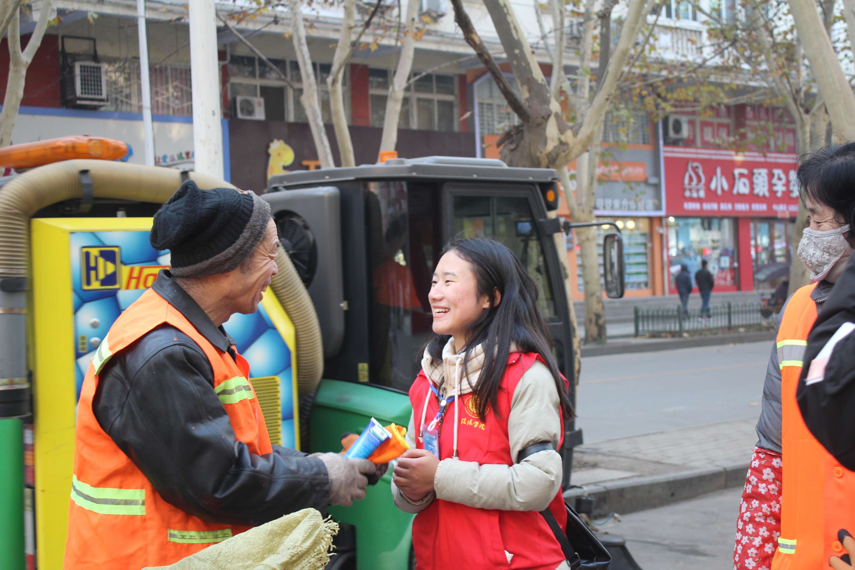 12月16日上午,志愿者服务中心的志愿者们继续在我市部分城区开展主题为“点滴聚爱心 温情暖环卫”系列活动。